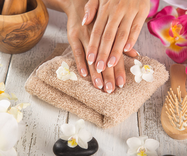 Hands are prepped for the gel polish application with the Spa Manicure. The polish is cured with an LED light and dries instantly. Gel polish feels weightless on your natural nails and lasts longer than regular polish.